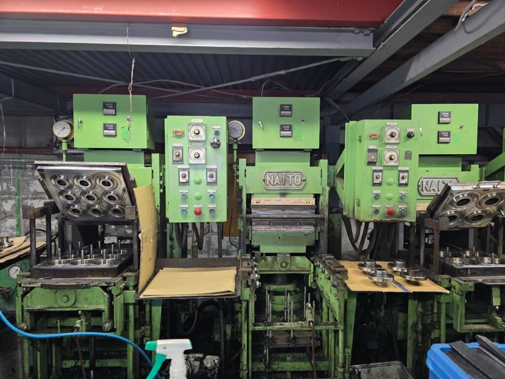 Technical Note: Our facility features a dedicated bank of highly rigid 100-Ton NAITO cast-frame presses. This multi-station setup allows us to run multiple multi-cavity molds simultaneously, ensuring efficient, high-volume production runs with consistent curing temperatures across all stations.